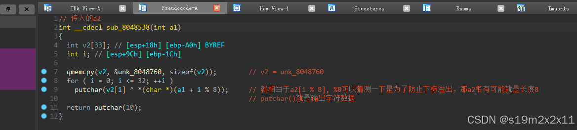每次完成赋值goto到 LABEL_19 会对a2重新运算 7 * (a2 + 1) % 11 ,写一个脚本跑一下 (当然也可以手算)